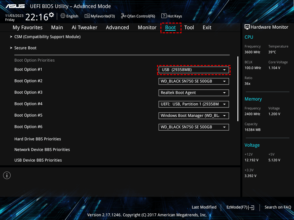 1. Commencez par brancher la clé USB sur un port USB. Ensuite, pour modifier la séquence de démarrage du BIOS.