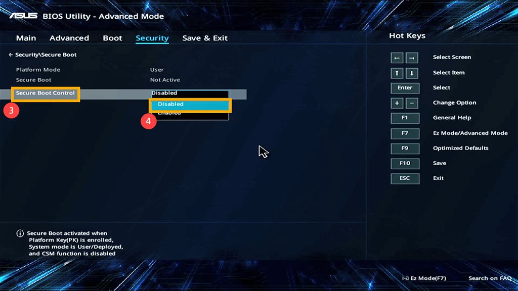 Après être entré dans l'écran [Secure Boot], sélectionnez [Secure Boot Control] puis sélectionnez [Disabled].