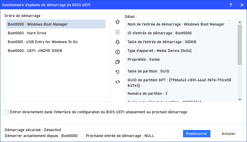 Si vous pouvez démarrer Windows sur l'ordinateur, avec le gestionnaire d'options de démarrage UEFI BIOS dans AOMEI Partition Assistant, vous pouvez facilement et rapidement modifier les options de démarrage du BIOS UEFI sans entrer manuellement dans le BIOS ni effectuer de modifications complexes des entrées de démarrage.