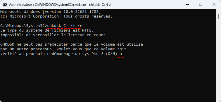 Étape 3. Si le système vous indique que le disque est en cours d’utilisation, tapez O pour planifier la vérification au prochain redémarrage.