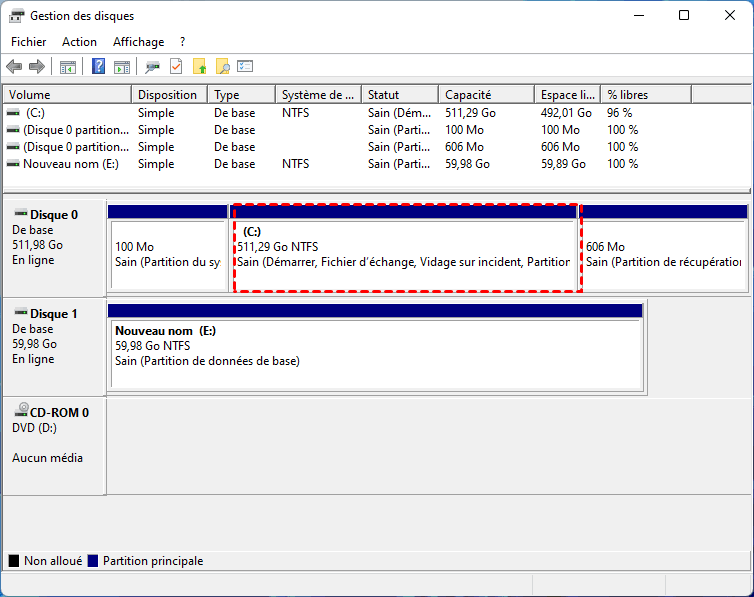 Cette méthode convient lorsque vous disposez d’un espace non alloué juste à côté de la partition C et que votre disque est simple. Elle ne nécessite aucun logiciel supplémentaire et est rapide à réaliser.