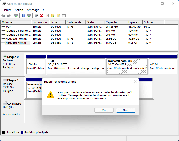 Si vous n’avez pas d’espace non alloué adjacent, il est possible de libérer de l’espace en supprimant une partition voisine, à condition que celle-ci ne contienne pas de données importantes ou que vous les ayez sauvegardées.