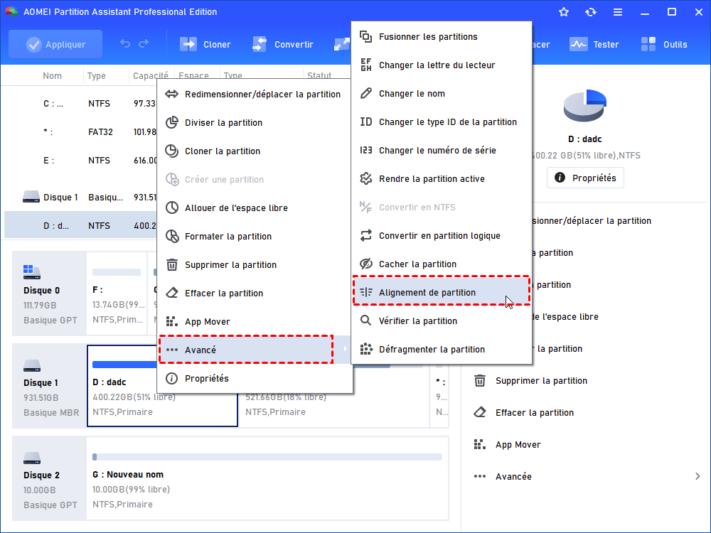 Étape 1. Faites un clic droit sur la partition sur votre SSD et choisissez Avancé et Alignement de partition.