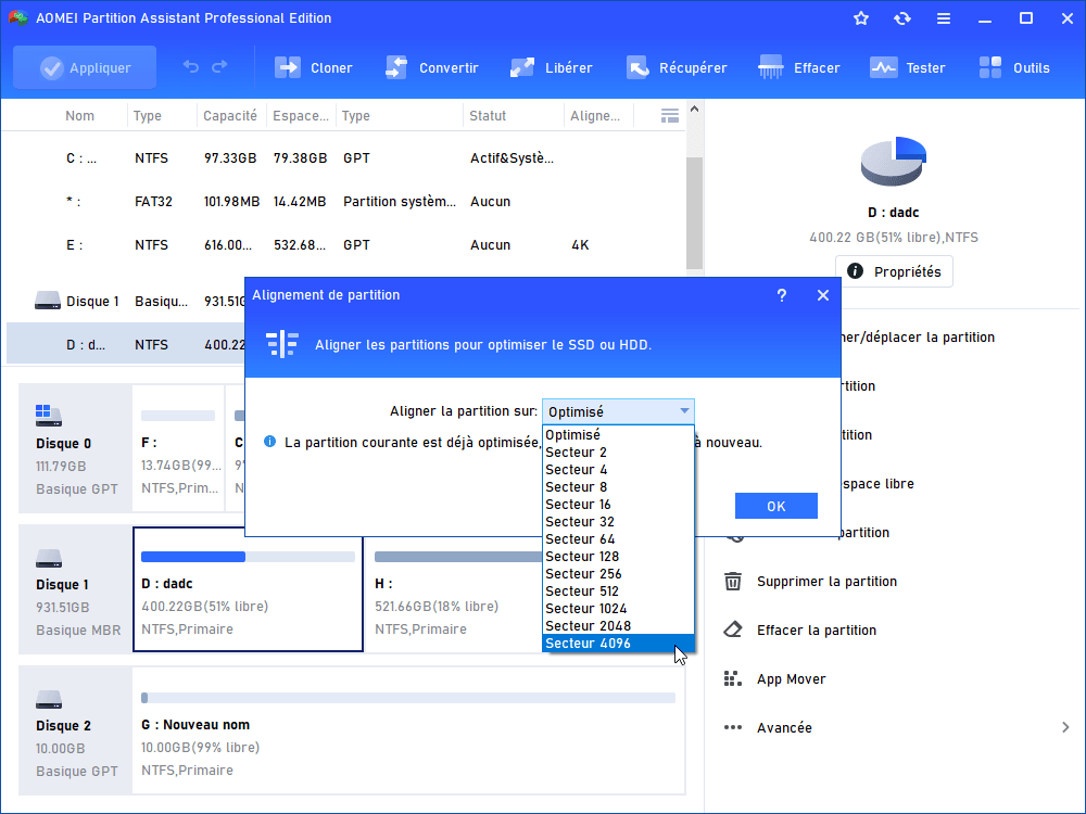Pour les SSD, l’alignement correct des partitions est crucial pour garantir des vitesses d’écriture et de lecture optimales et prolonger la durée de vie du disque.