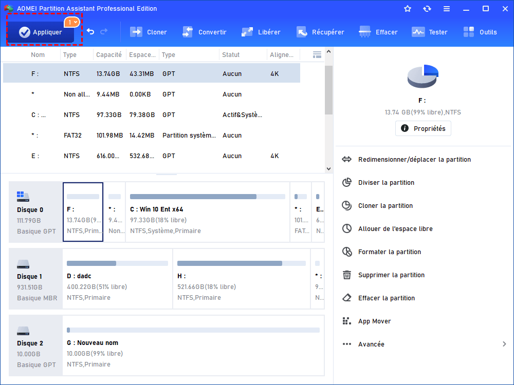 ✅ Remarques : AOMEI Partition Assistant est un logiciel complet et professionnel pour la gestion des partitions et des disques durs, il permet de redimensionner/déplacer, fusionner, vérifier, formater, effacer les partitions, cloner le disque dur, migrer l'OS, convertir en GPT/MBR sans perte, déplacer des logiciels sur un autre lecteur sans réinstaller, récupérer la partition supprimée, effacer le disque dur, convertir en disque dynamique ou en disque de base sans rien perdre, etc.