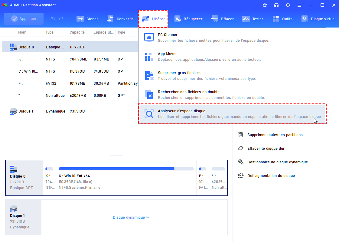 Pour libérer plus d'espace disque, AOMEI Partition Assistant est aussi un bon choix, vous pouvez utiliser ses fonctionnalités sous l'onglet Libérer :