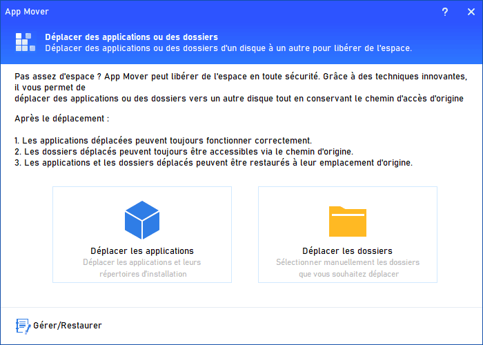 - APP Mover : pour déplacer des programmes ou des dossiers d'un lecteur à un autre sans réinstaller.