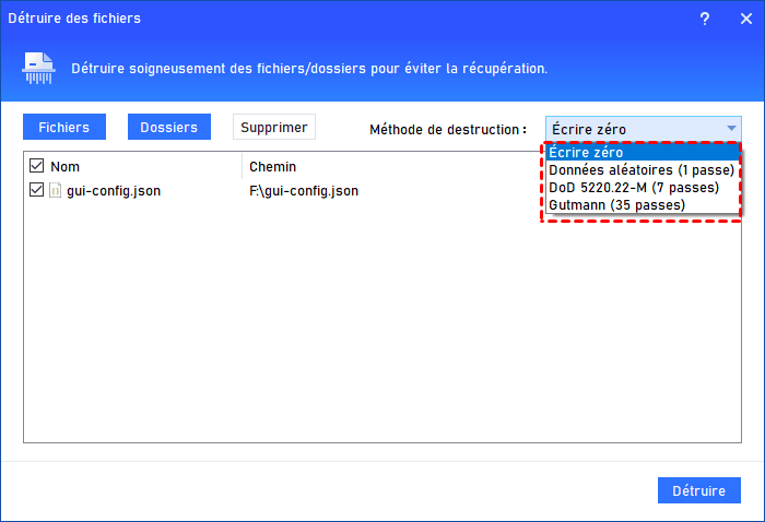 Étape 1 : Pour effacer des fichiers ou dossiers, cliquez sur Effacer > Détruire des fichiers.