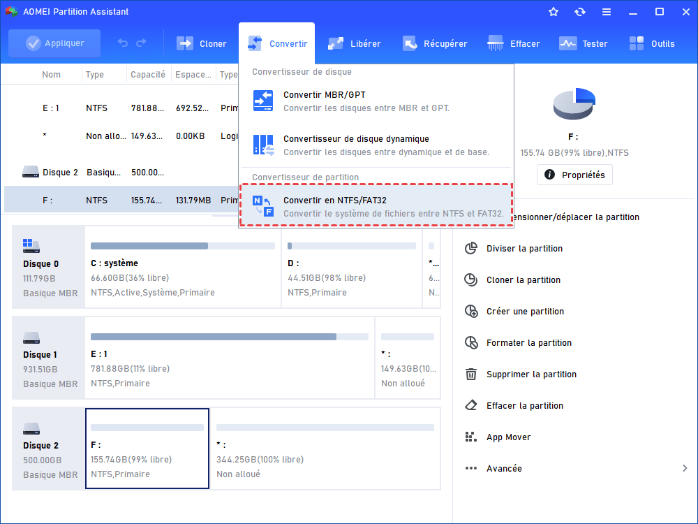 2. Allez dans « Avancé », puis choisissez « Convertir en FAT32 ».