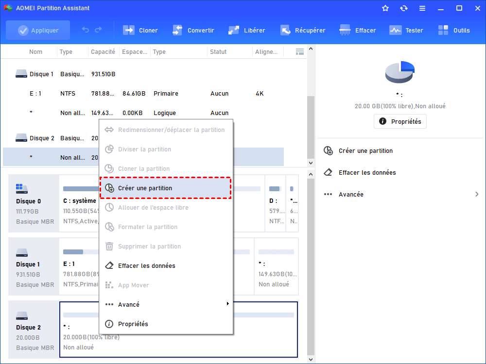2. Faites un clic droit directement sur cette barre grise, pas sur le texte à côté. Dans le menu, sélectionnez « Créer une partition ».