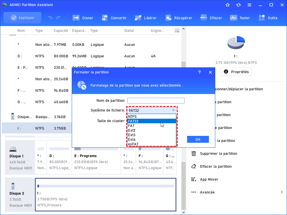 - Il convertit les systèmes de fichiers sans perdre vos photos : besoin de passer de NTFS à FAT32 mais vous avez 200 photos dessus ? La fonction « Convertir en FAT32 » d'AOMEI Partition Assistant le fait sans effacer. C'est énorme.