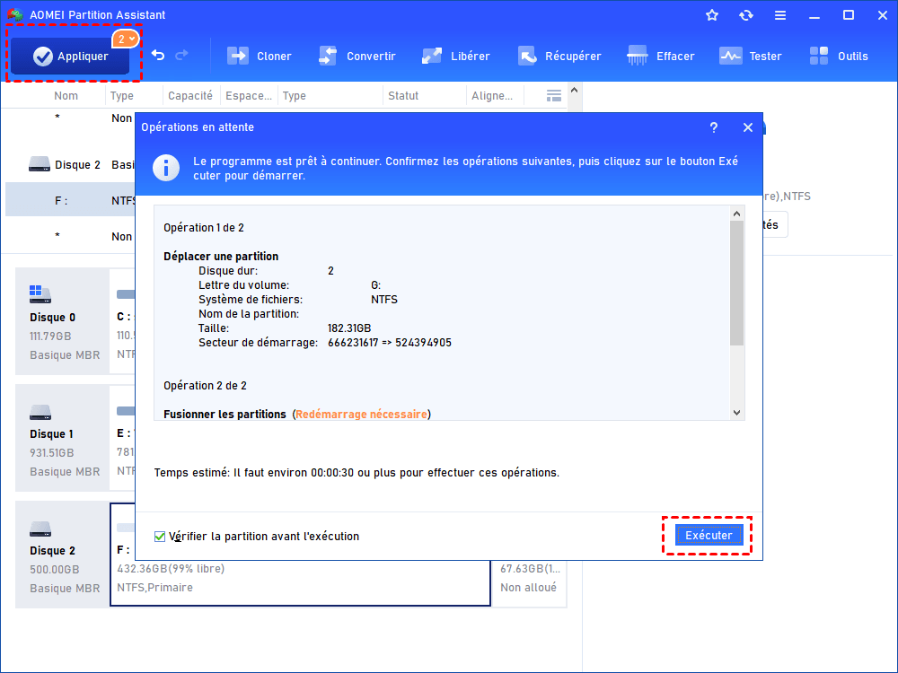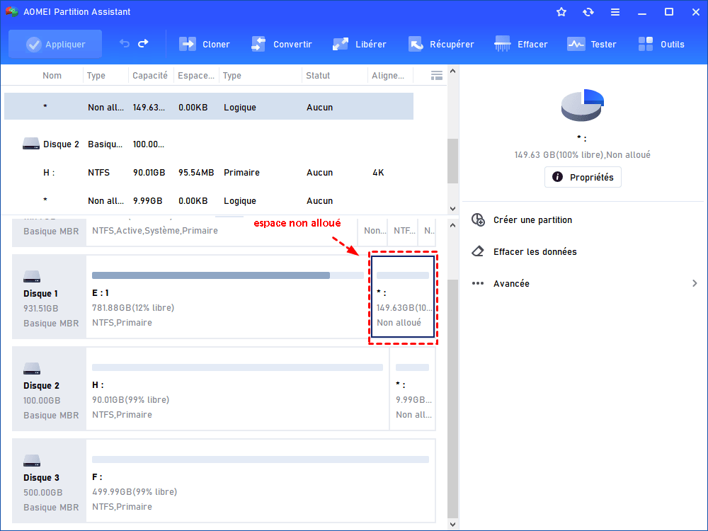 5. En haut à gauche, cliquez sur « Appliquer ». Le logiciel vous demande confirmation. Validez. En quelques secondes, toute la capacité de la carte est réunie.