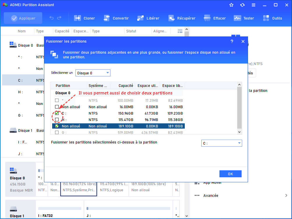 4. Cochez la case de l'espace non alloué pour le fusionner avec la partition principale. Cliquez sur OK.