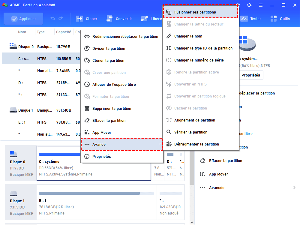 3. Faites un clic droit sur la partition principale (celle qui est reconnue) et choisissez « Fusionner les partitions ». Une nouvelle fenêtre s'ouvre.