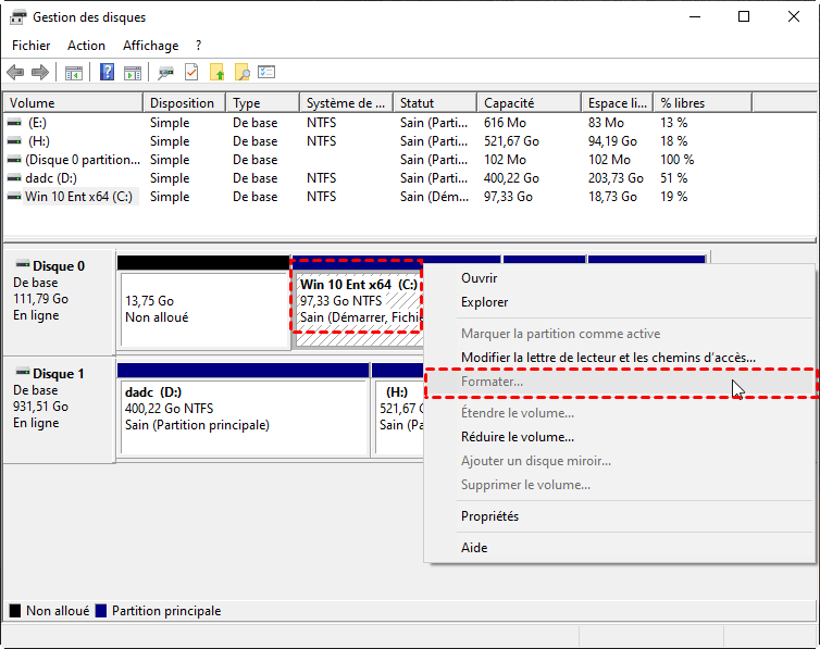 Pour formater les autres partitions sur le disque dur, vous pouvez directement utiliser Gestion des disques. Quant à la partition système, la manière la plus simple est de formater le disque C est de démarrant Windows à partir d'un CD d'installation ou d'une clé USB bootable.