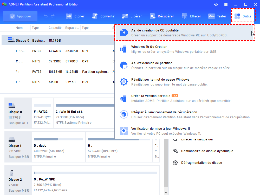 Dans l'interface principale, cliquez sur Outils puis As. de création de CD bootable.