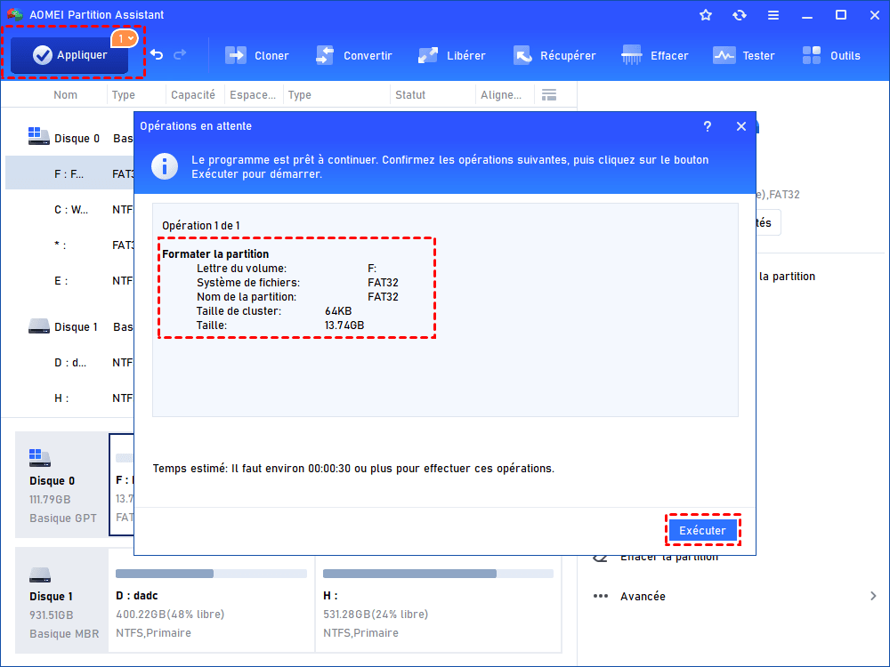 Vous reviendrez dans l'interface principale, cliquez sur Appliquer et ensuite Exécuter pour valider les opérations en attente.
