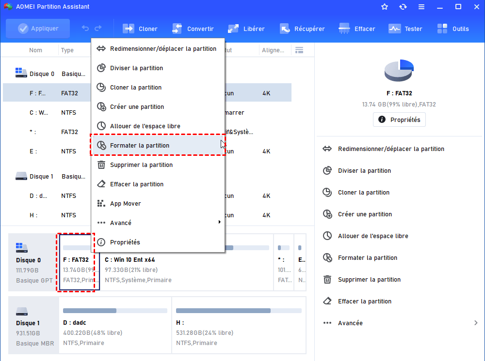 S'il n'y a pas de CD d'installation, vous pouvez aussi créer une clé USB bootable avec AOMEI Partition Assistant pour formater le disque système. Comme son interface française et des guides claires, ce sera facile de formater le disque C.