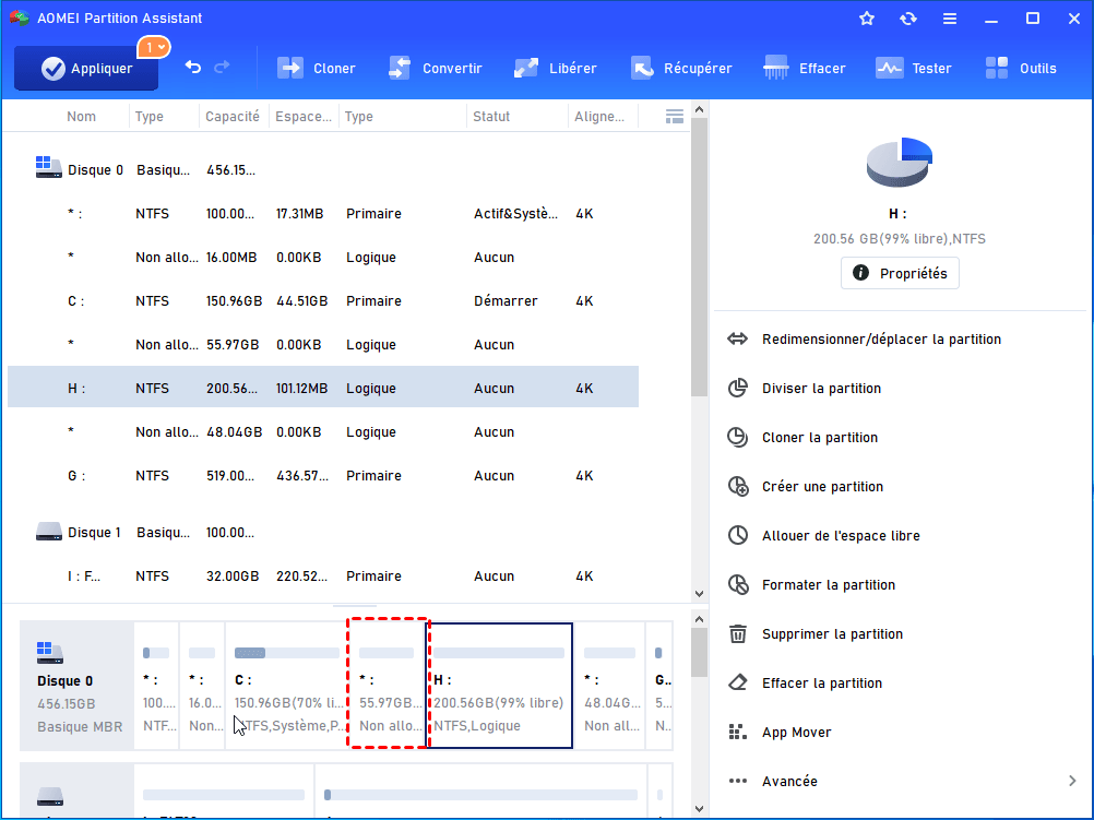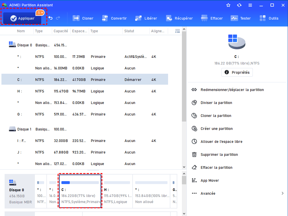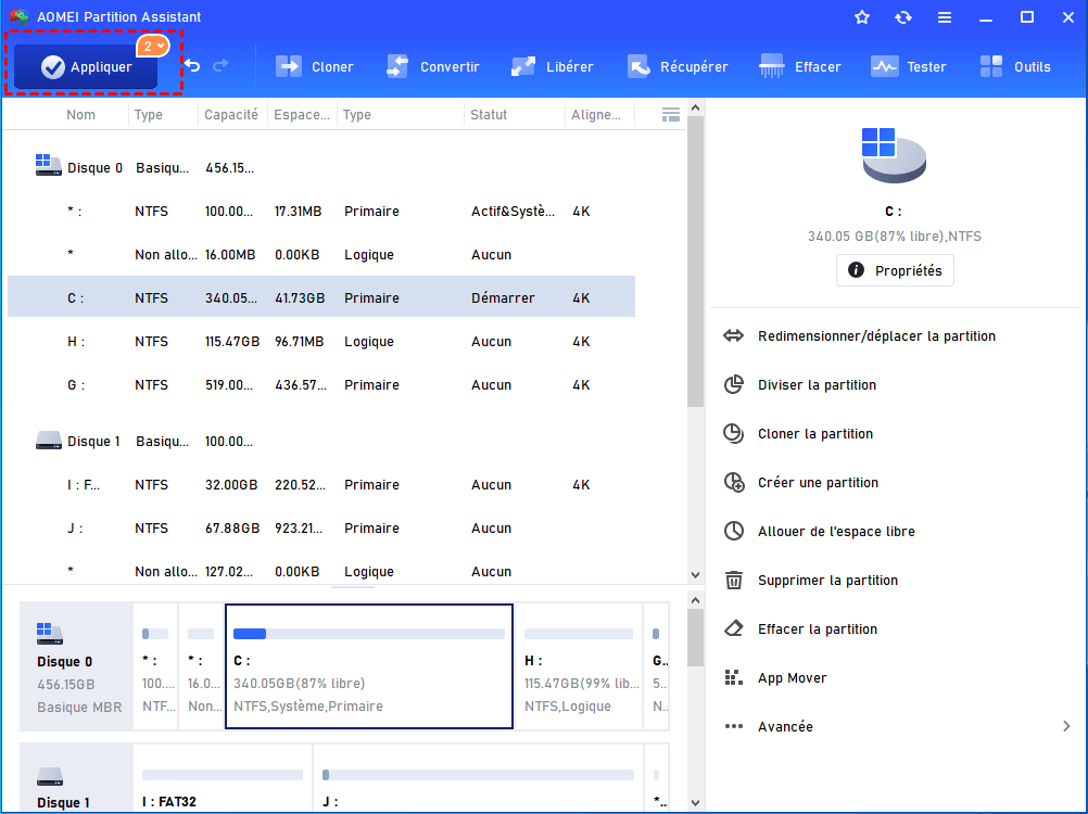 Cliquez sur Appliquer pour valider les opérations en attente.