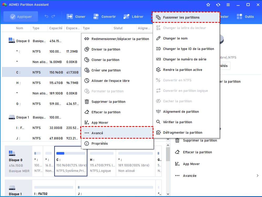 Faites un clic droit sur la partition que vous voulez fusionner et sélectionnez Avancé > Fusionner les partitions.