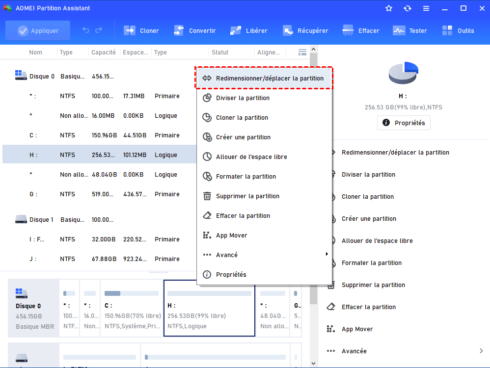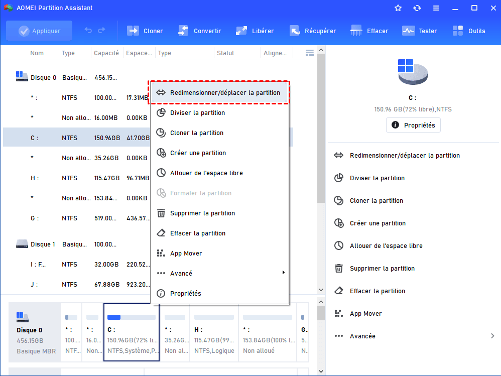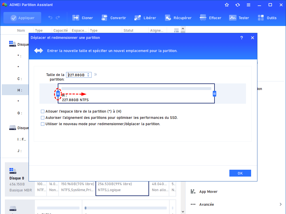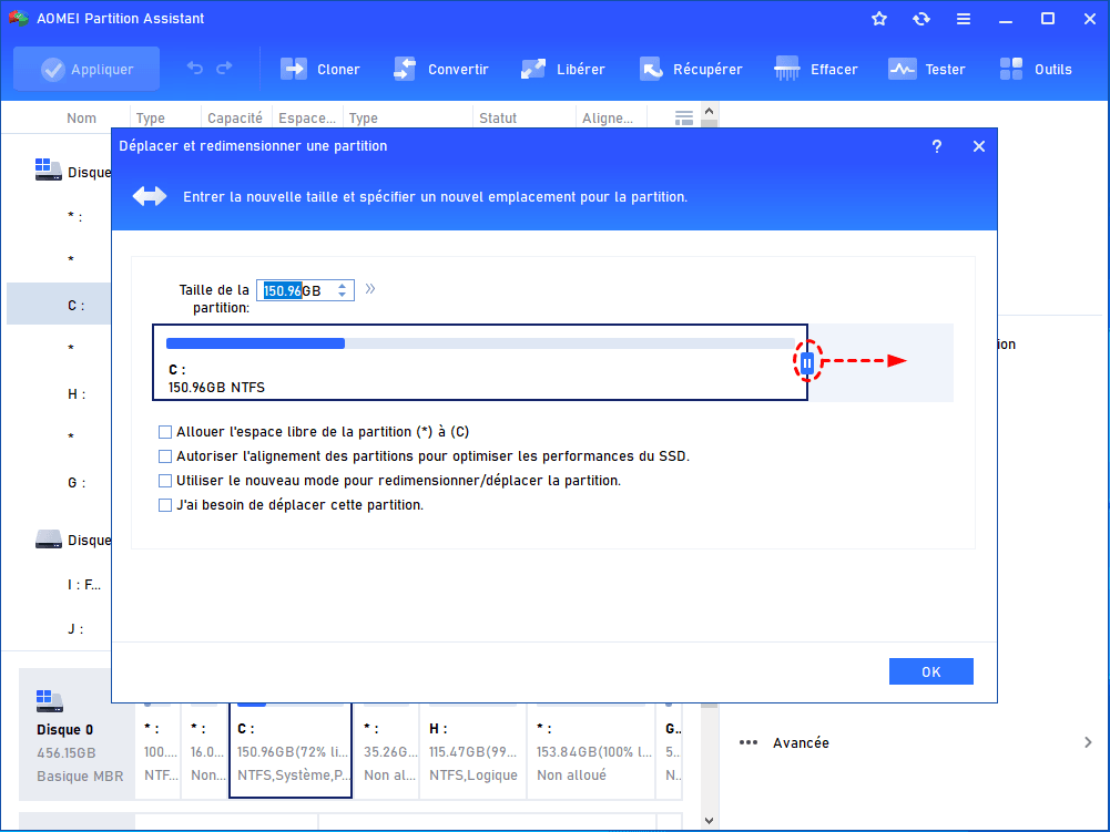 - ✔️ La fonction Redimensionner permet d’agrandir ou de réduire une partition, tandis que la fonction Déplacer permet de changer la position d’une partition et de l’espace non alloué adjacent.