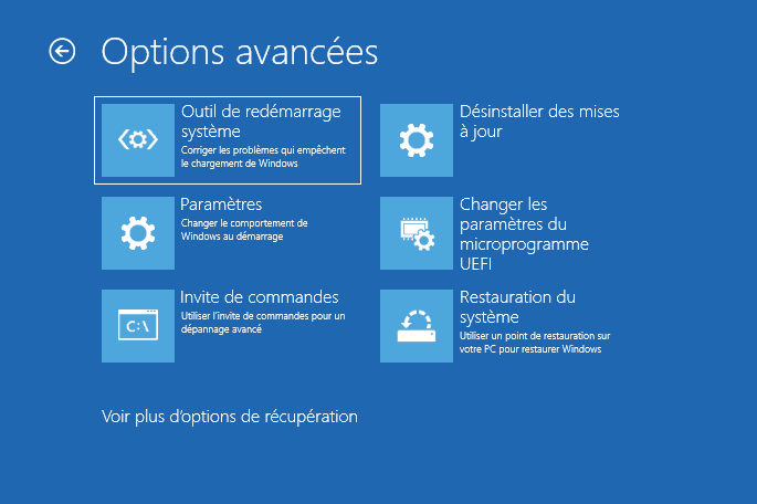 Sélectionnez « Options avancées », puis « Outil de redémarrage système ».