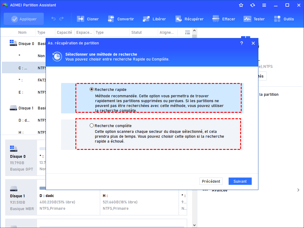 - Note : Commencez par utiliser la première méthode ; si aucune partition perdue n’est détectée lors de l’analyse, passez alors à la deuxième méthode.