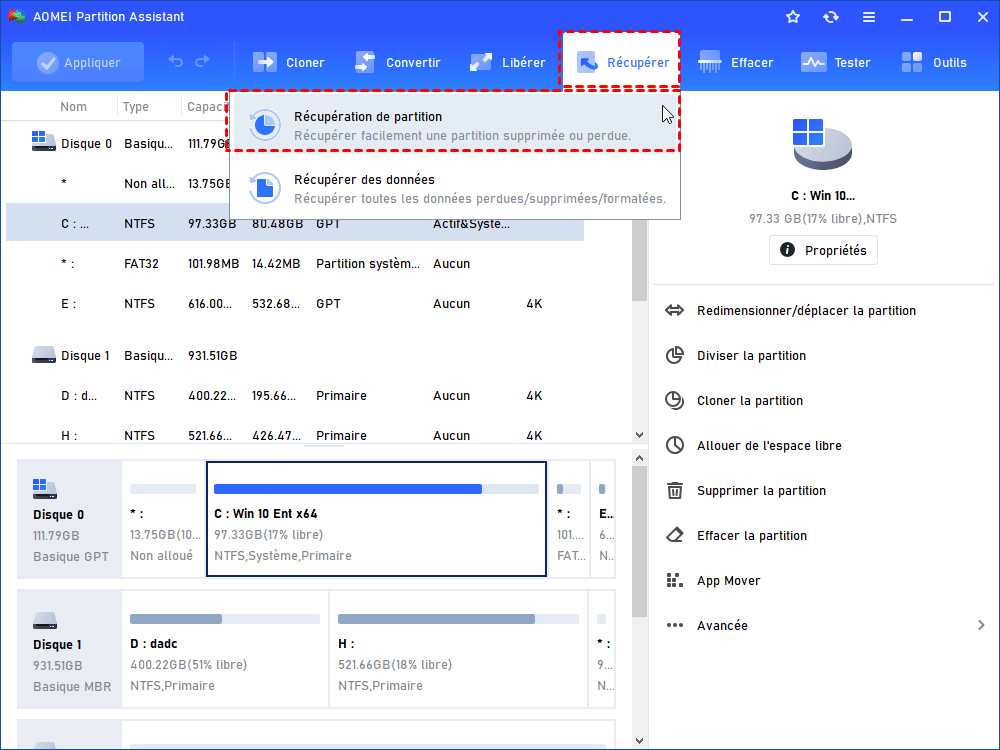 La suppression accidentelle de la partition EFI provoque généralement l’échec du démarrage de Windows, car cette partition contient les fichiers essentiels au lancement du système et permet au firmware UEFI de localiser l’environnement de démarrage. En cas de suppression par erreur, il est toutefois possible de tenter de la récupérer à l’aide de la fonction de récupération de partition d’AOMEI Partition Assistant.