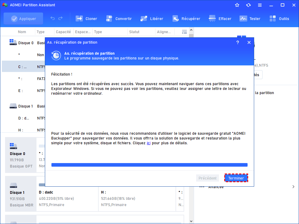 Étape 5. Lorsque vous êtes informé que les partitions ont été récupérées avec succès..., cliquez sur "Terminer".
