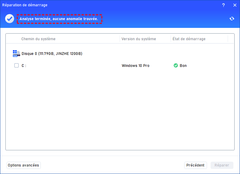 Étape 5. Le programme vérifiera l'état de démarrage de votre système. Une fois le processus terminé, il affichera le résultat d'analyse : les chemins système, les versions système et l'état de démarrage. Et toutes les entrées de démarrage réparables seront disponibles pour la sélection.