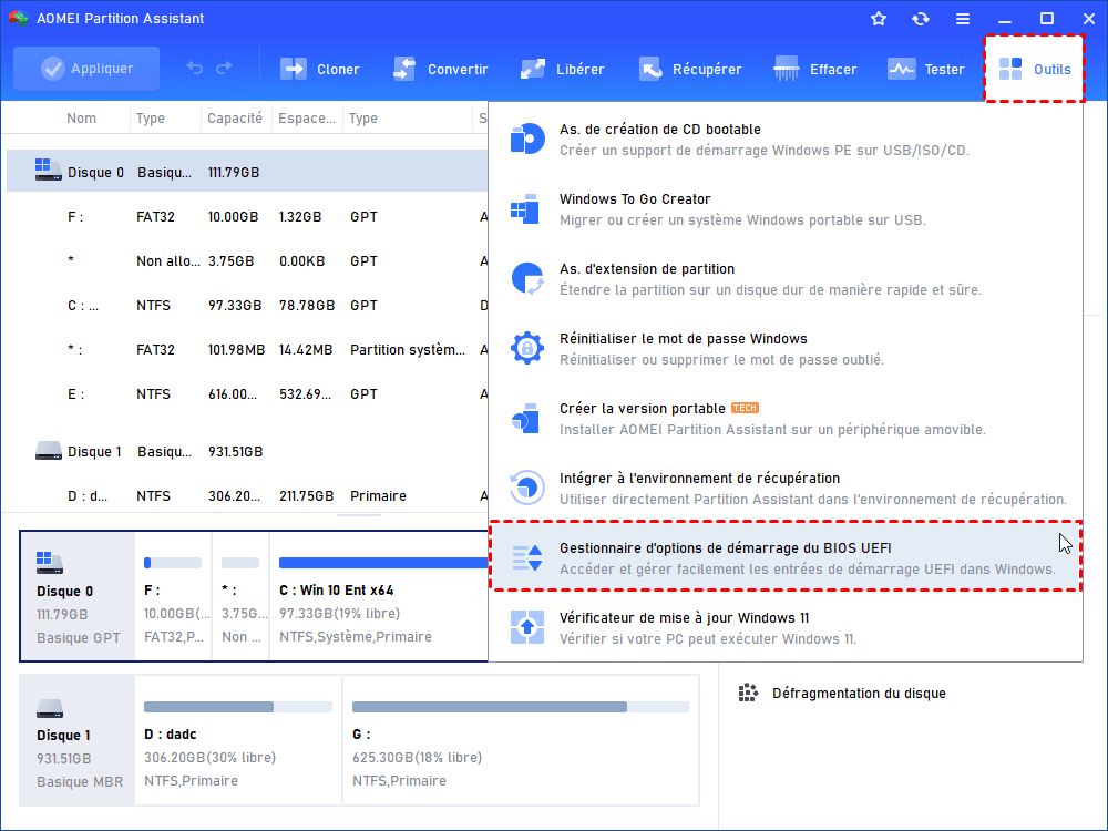 Le logiciel propose notamment un Gestionnaire d’options de démarrage UEFI qui permet de :