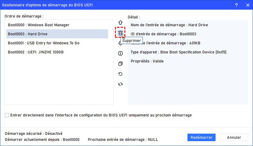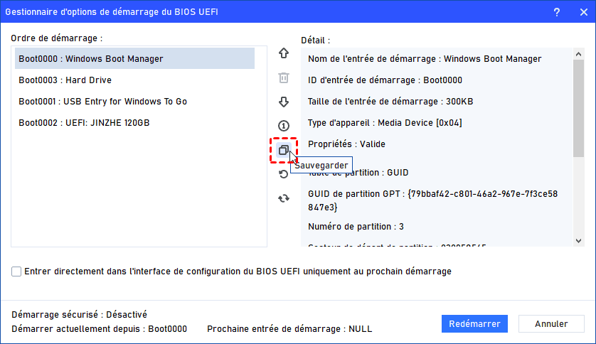 Étape 2. Avant de supprimer une entrée de démarrage, il est conseillé de sauvegarder les entrées de démarrage actuelles localement. En cas d’erreur, vous pourrez les restaurer facilement.