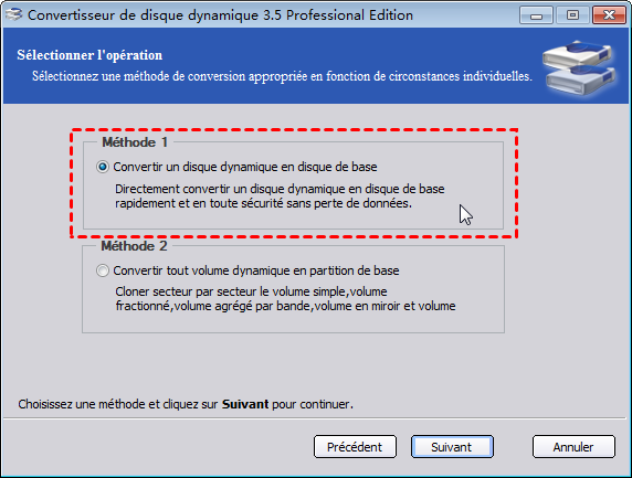 Étape 3 : Sélectionnez Méthode 1 pour convertir directement le disque dynamique en disque de base et cliquez sur Suivant.