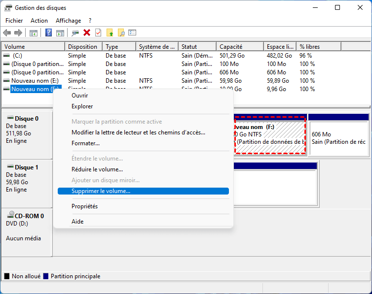 Faites un clic droit sur chaque partition du disque et choisissez Supprimer le volume jusqu’à ce que le disque soit entièrement non alloué.