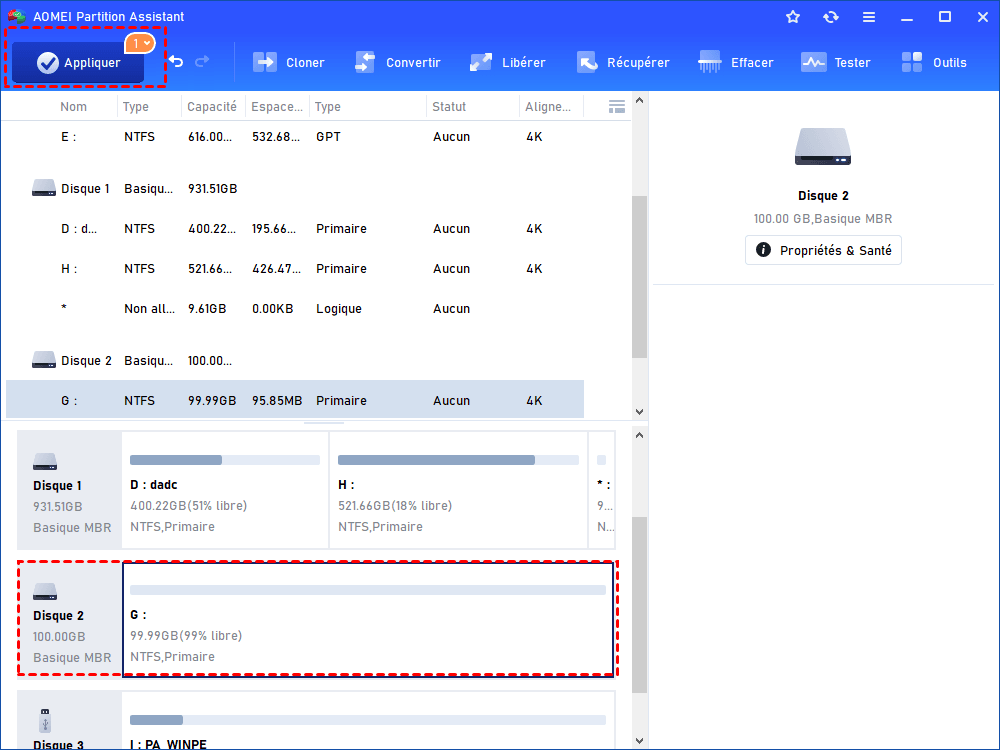 Vous pouvez utiliser des outils natifs Windows, mais il faut supprimer les partitions sur le disque dur avant la conversion, donc, vous perdrez des données dessus. Pour convertir un disque dur MBR en GPT, ou GPT en MBR, sans perte de données, vous pouvez utiliser le logiciel puissant AOMEI Partition Assistant.