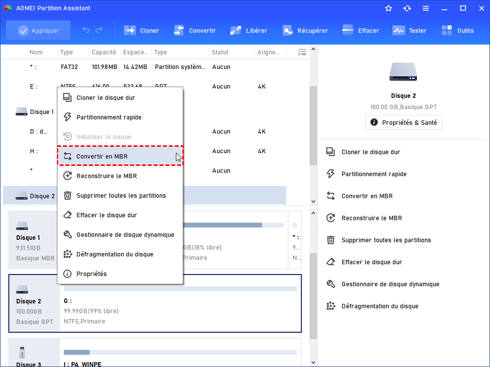 Lancez AOMEI Partition Assistant sur votre ordinateur et localisez le disque GPT (MBR) que vous souhaitez convertir. Clic-droit dessus et choisissez "Convertir en MBR" ou "Convertir en GPT".