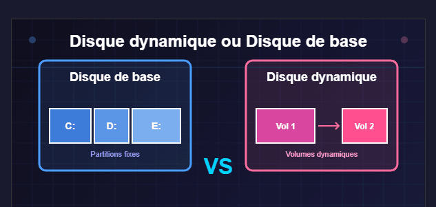 Un disque dynamique est un type de gestion de disque sous Windows qui offre plus de flexibilité que les disques de base classiques. Contrairement aux disques de base qui se limitent aux partitions simples, un disque dynamique permet de créer des volumes qui peuvent s'étendre sur plusieurs disques physiques, fusionner des espaces libres et offrir des solutions de redondance ou de performance.