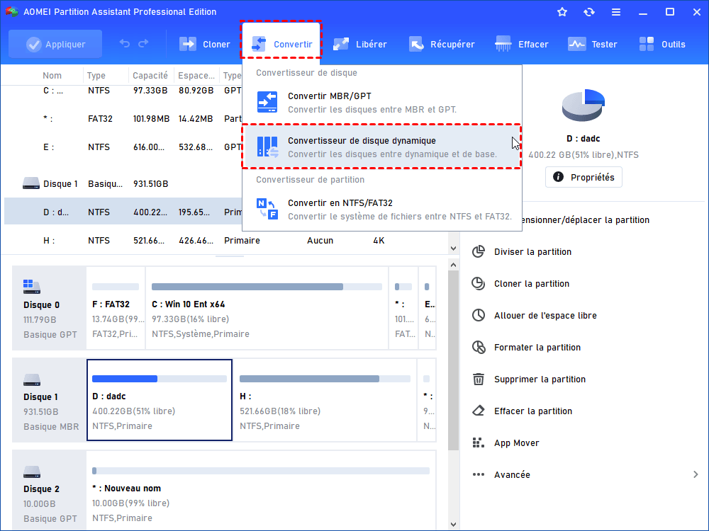 Ou vous pouvez utiliser son Convertisseur de disque dynamique : dans l'interface principale, cliquez sur l'onglet Convertir, Convertisseur de disque dynamique. Ensuite, suivez les indications pour terminer la conversion.