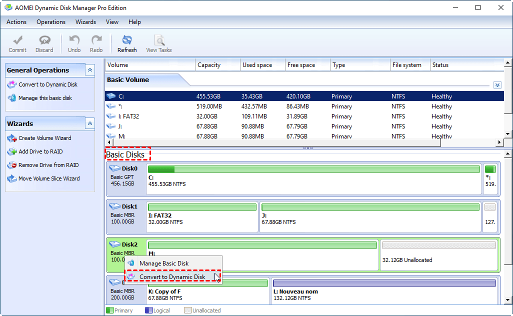 AOMEI Partition Assistant vous permet de convertir en disque dynamique ou disque de base sans perte de données. De plus, son gestionnaire de disque dynamique peut aussi étendre, réduire le volume dynamique, créer un RAID logiciel, ajouter disque au RAID, retirer un disque du RAID, etc.