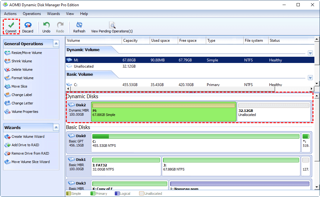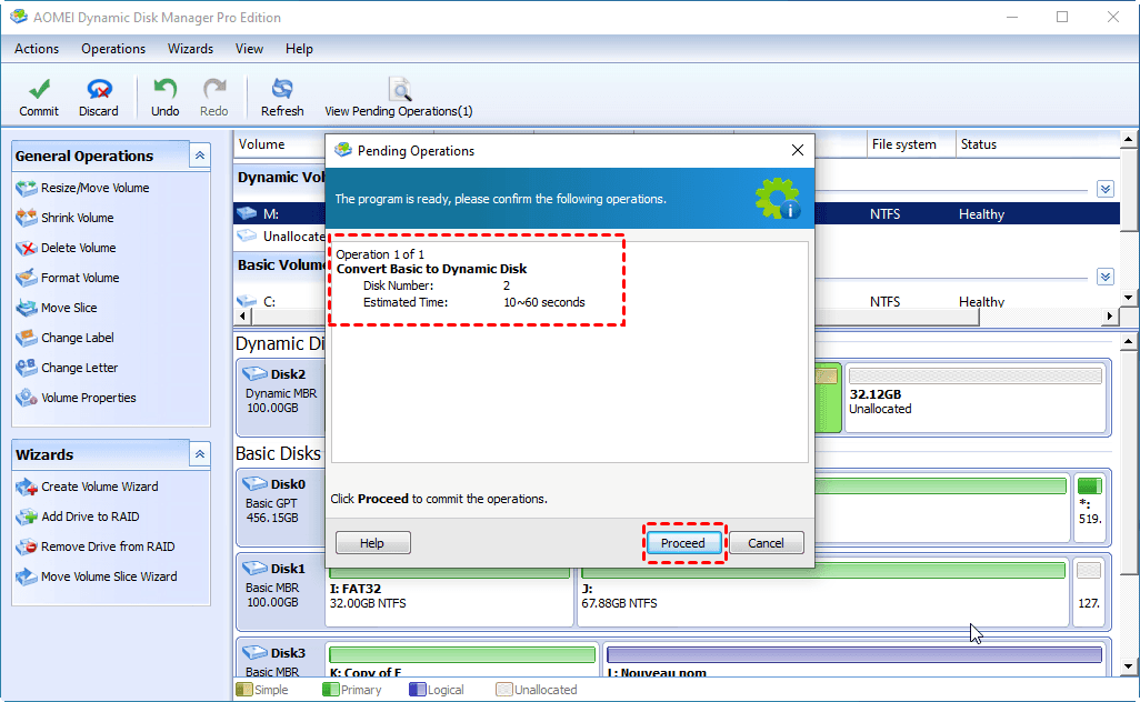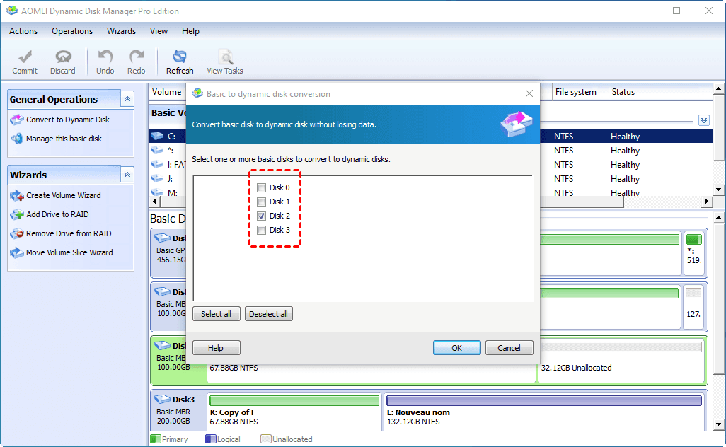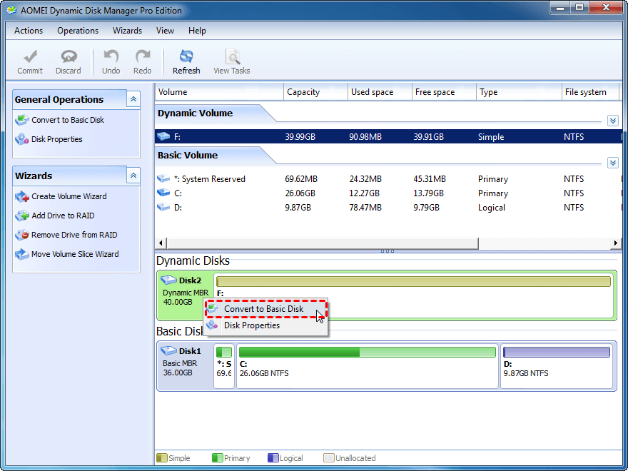Un utilisant AOMEI Partition Assistant, vous pouvez convertir un disque dynamique en disque de base sans perte de données depuis son gestionnaire de disque dynamique.