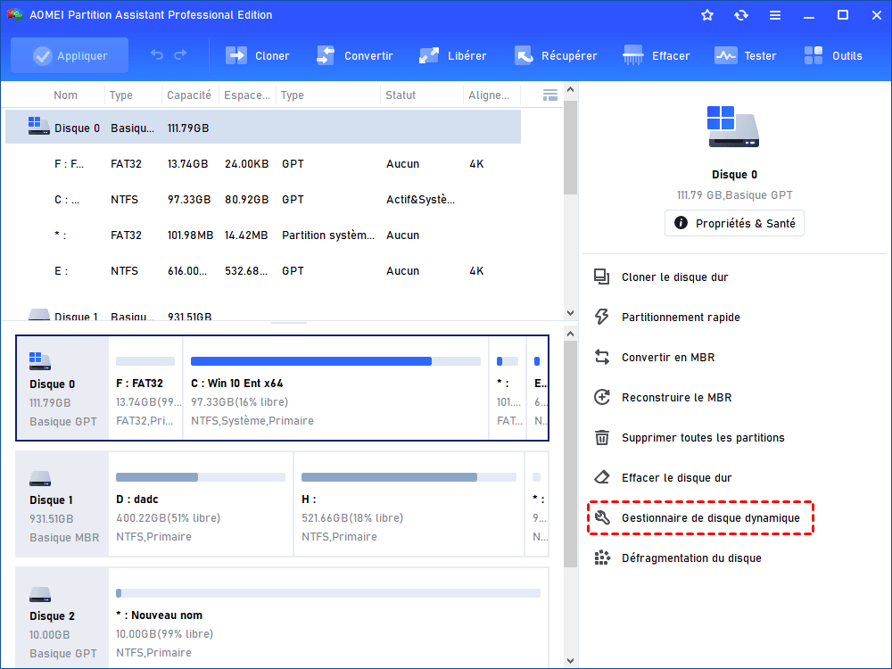 Découvrez comment convertir en disque dynamique sur Windows 11/10/8/7 via des outils natifs Windows ou le logiciel plus puissant AOMEI Partition Assistant. Pour convertir un disque dynamique en basique sans perte de données, ce logiciel peut aussi vous adier.