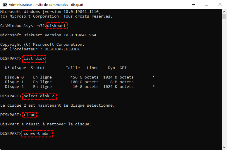 Étape 2 : Une fenêtre de commande noire s'ouvre. Suivez exactement les mêmes instructions que la Méthode 1 (diskpart, list disk, select disk, clean, convert mbr).