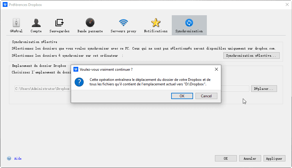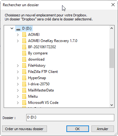 Étape 6 : Choisissez un nouveau dossier sur un autre disque, par exemple D:\Dropbox.