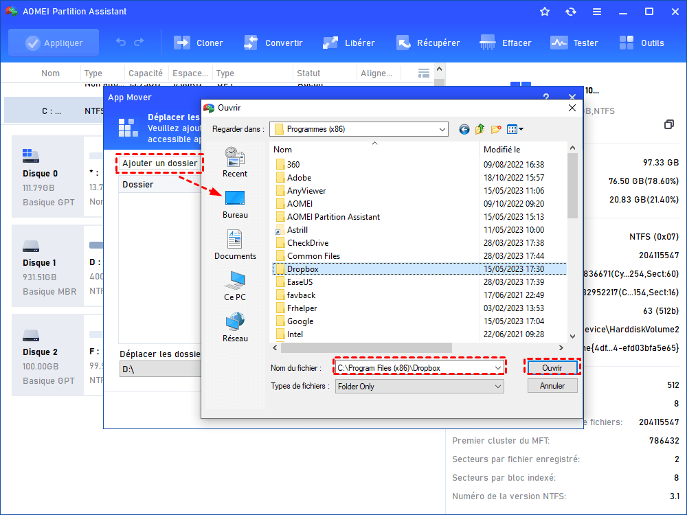 Si vous craignez une perte de données en déplaçant le dossier Dropbox via les Préférences de l’application, vous pouvez utiliser un outil plus sûr et automatisé : Logiciel de partition AOMEI. Sa fonction APP Mover permet de déplacer facilement des applications et leurs dossiers associés — comme Dropbox, Steam ou d’autres logiciels volumineux — vers un autre disque, sans réinstallation ni perte de fichiers.