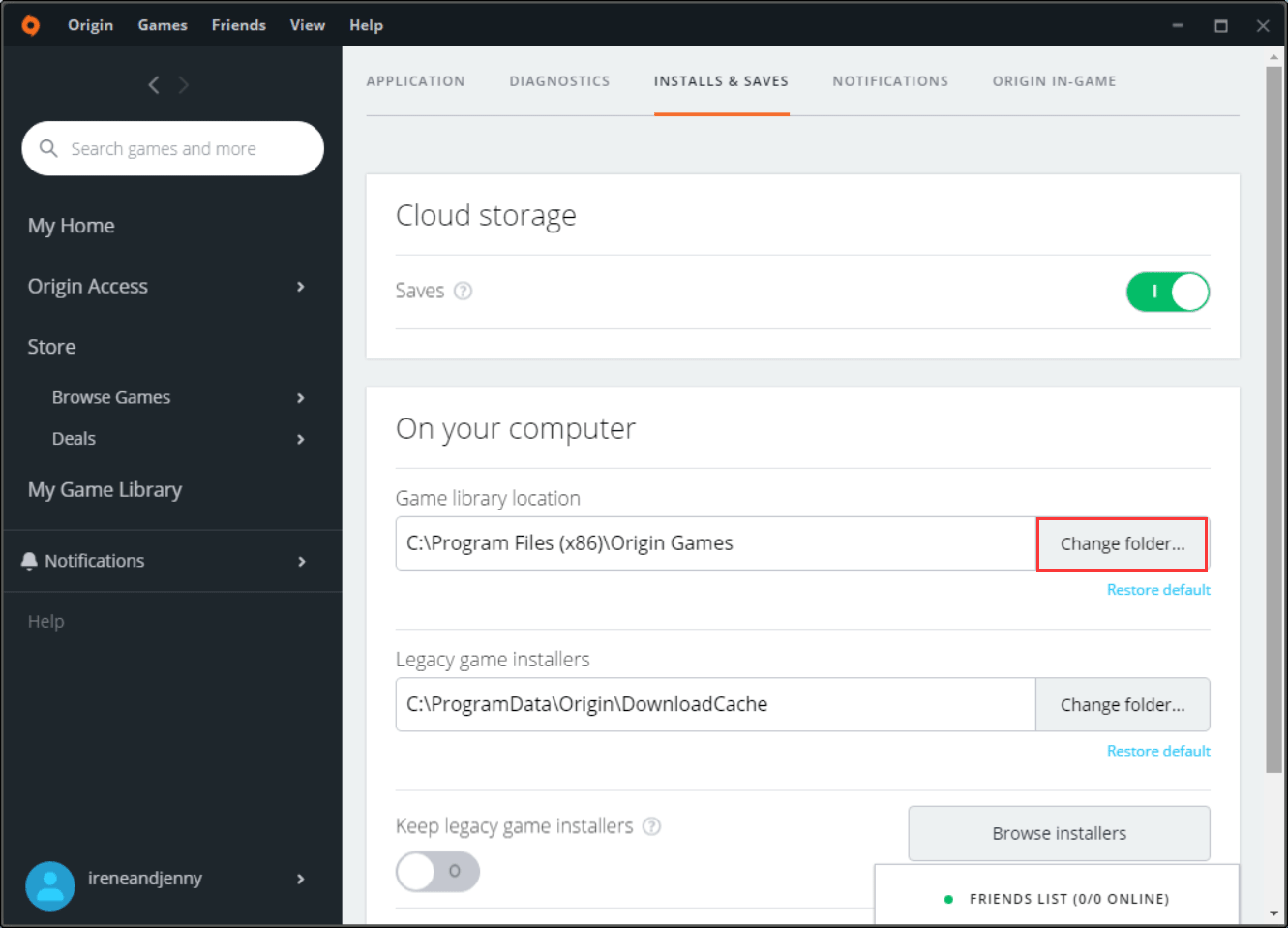 Étape 2 : Cliquez sur le bouton "Installs & Saves" sur la nouvelle page. À droite de "Game Library Location", cliquez sur le bouton "Change Folder" pour sélectionner le disque vers lequel vous souhaitez effectuer le transfert.
