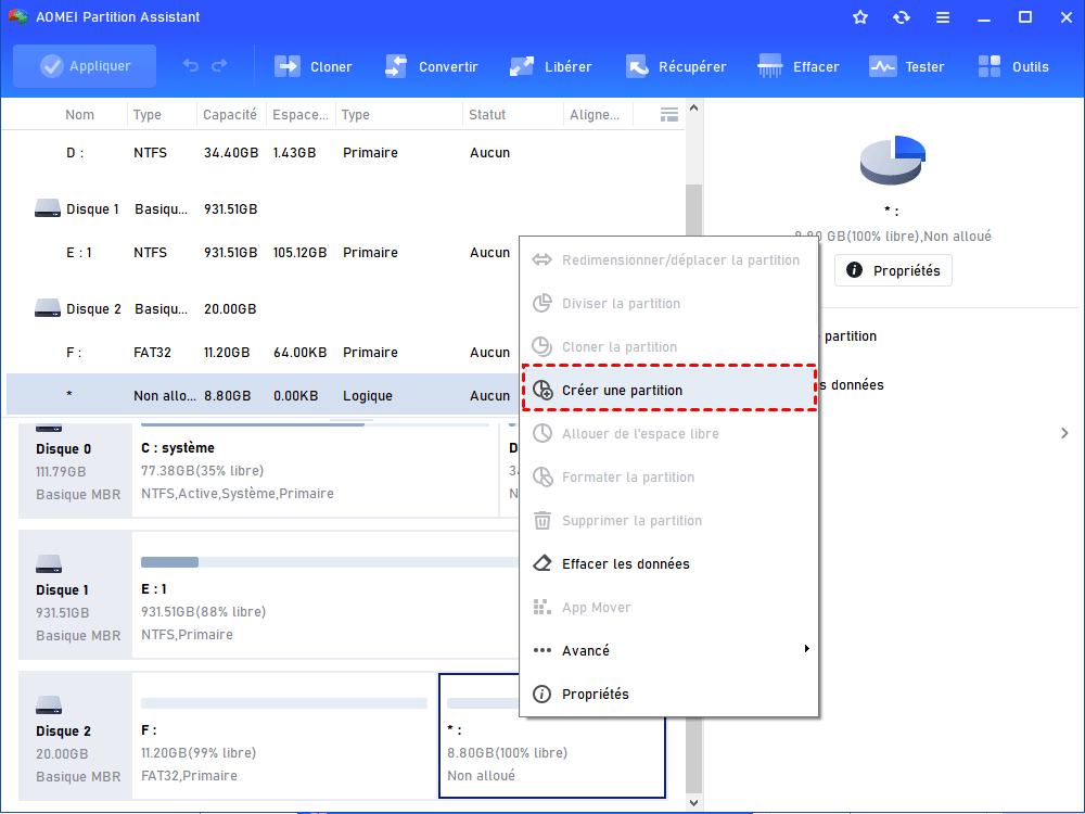 Étape 1. Clic-droit sur l'espace non alloué, sélectionnez Créer une partition.