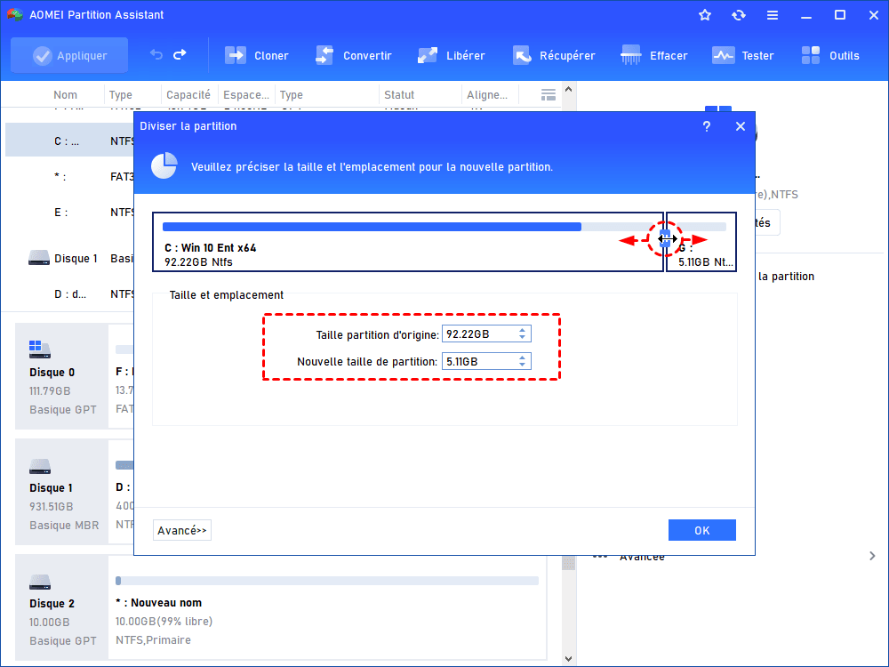 Étape 2 : Déplacez la bordure pour définir la taille de la nouvelle partition. Pour un SSD, cliquez sur Avancé et cochez la case pour optimiser les performances.