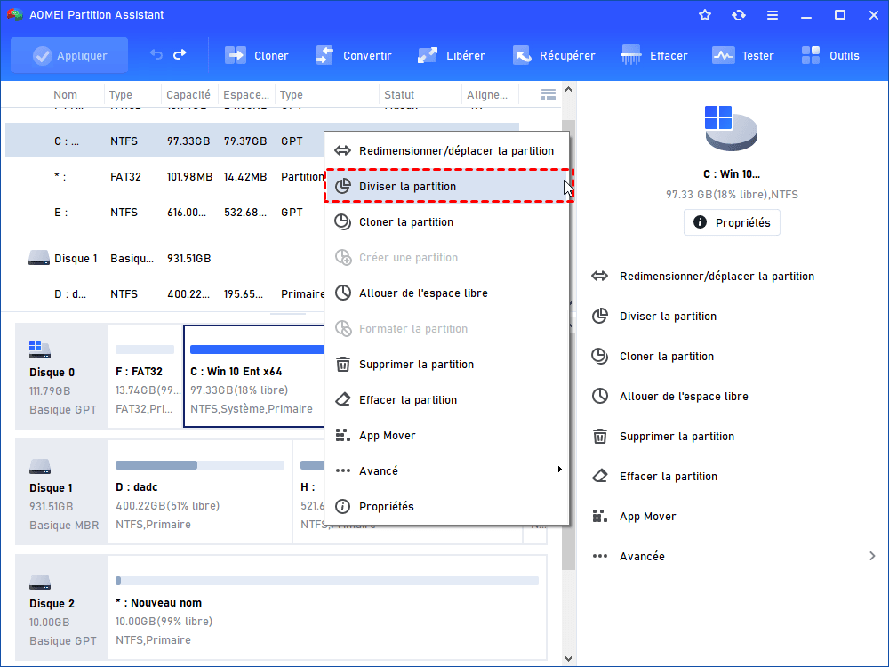 Si vous ne souhaitez pas réduire une partition puis créer un nouveau volume dans l’espace non alloué, Logiciel de partition AOMEI propose une solution plus simple : la fonction « Diviser la partition ». Elle permet de scinder directement une partition en deux sans perte de données.