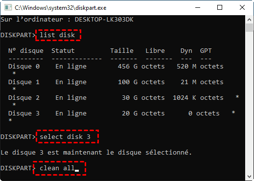 Cette opération supprime définitivement toutes les partitions et toutes les données du disque sélectionné. Vérifiez donc soigneusement que vous avez choisi le bon disque avant d'exécuter la commande.