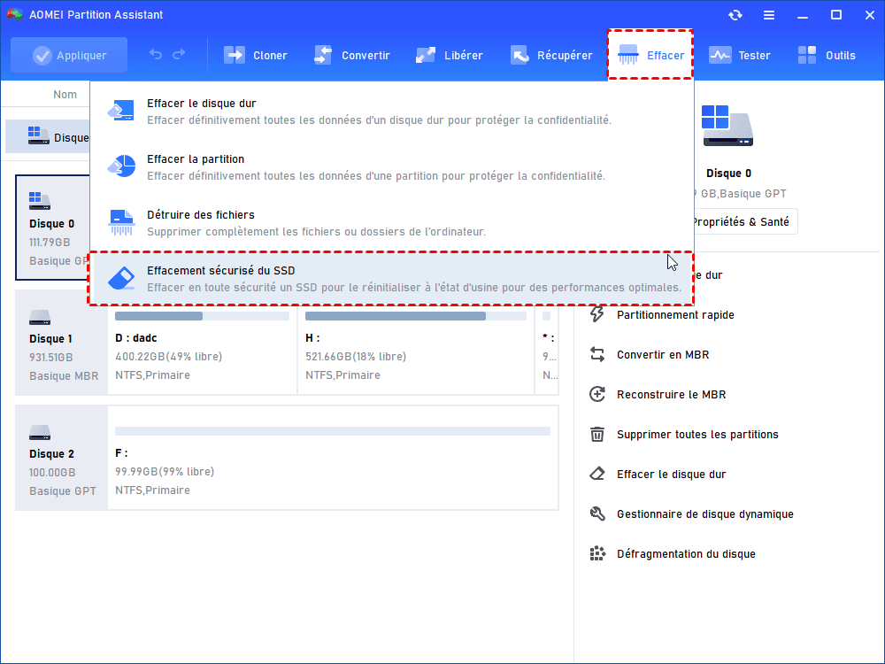 Pour effacer un disque SSD en toute sécurité, vous pouvez choisir la fonction « Effacement sécurisé du SSD », qui supprime les données tout en respectant l'architecture du disque.